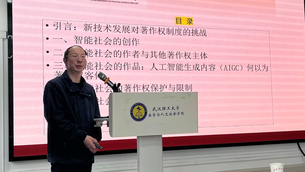冯晓青教授以“智能社会智力创作成果著作权保护新挑战及其应对”为题,系统探讨了生成式人工智能对传统著作权制度带来的主要冲击,重点讨论了“人机结合”模式下“创作”的含义,用户提示词的可版权性,并围绕人工智能生成物的法律属性,以及学术界相关理论学说进行了重点评析。
